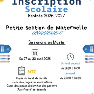 Inscription pour les PS uniquement Se rendre en Mairie du 27 au 30 avril 2026 Du lundi au jeudi de 8h30 à 11h00 Le mardi de...