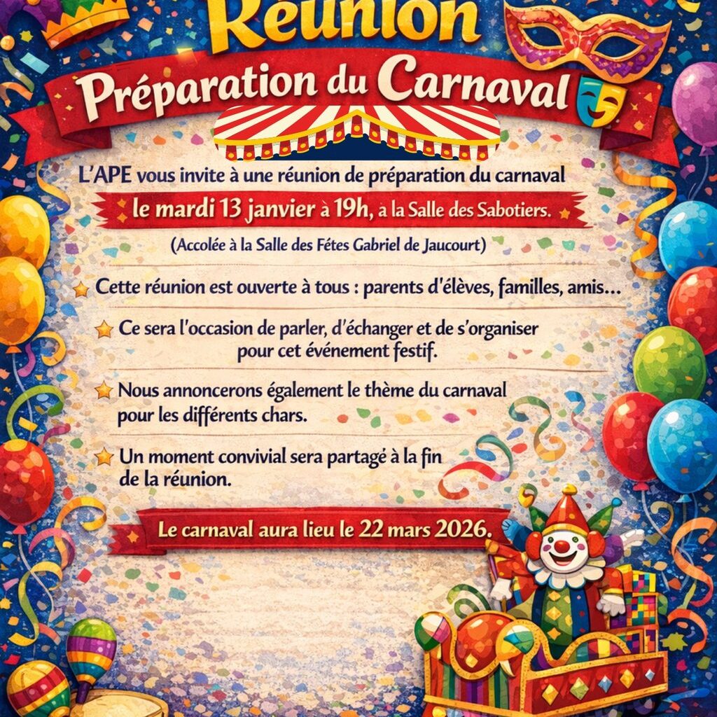 Réunion de préparation du Carnaval de Viglain Le mardi 13 janvier à 19h00 Salle des Sabotiers Non classé Article précédent Fermeture exceptionnelle SICTOM