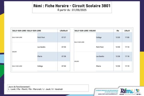 Horaires transport scolaire RÉMIHoraires circuit scolaire RÉMI à partir du 01/09/2025Lire la suite Horaires transport scolaire RÉMIHoraires circuit scolaire RÉMI à partir du 01/09/2025 Télécharger la pièce jointeLire la suite Horaires transport scolaire RÉMIHoraires circuit scolaire RÉMI à partir du 01/09/2025Lire la suite Calendrier des collectes du SictomLe calendrier des collectes 2025 concernent la collecte des bacs jaunes ainsi que celle des bacs à ordures ménagères. La collecte...Lire la suite « 1 … 13 14 15